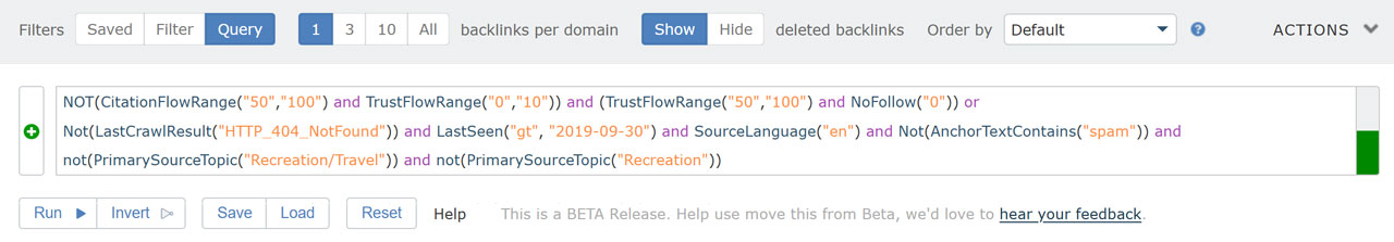 Before the introduction of Query builder, the ability to achieve a similar level of analysis was via the API or by downloading and filtering backlink results through a spreadsheet. Now, you can create your own custom queries that suit your backlink auditing needs. You can run them, save them, AND set your favourite queries to automatically apply when you open the Backlinks tab.