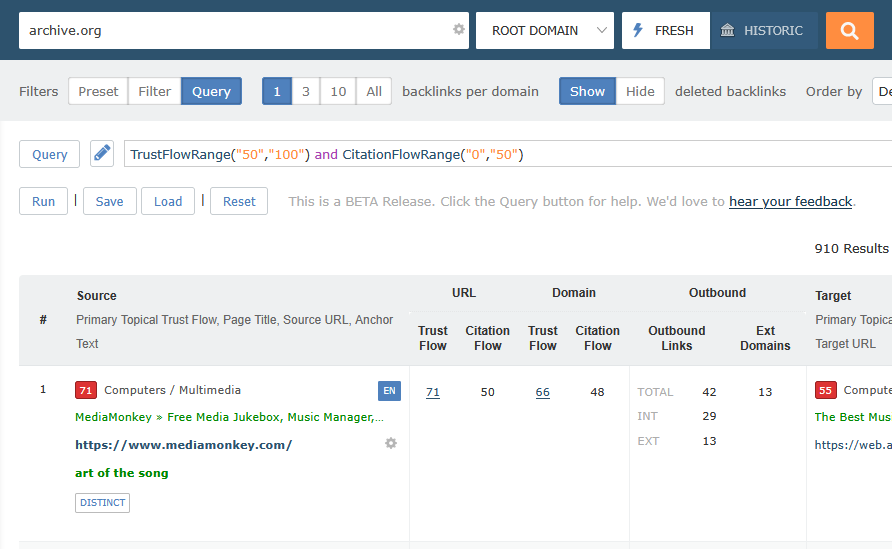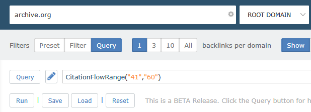 For this example, we’re going to look for links to archive.org that have a very high Trust Flow (>50), and a lower Citation Flow (<50).