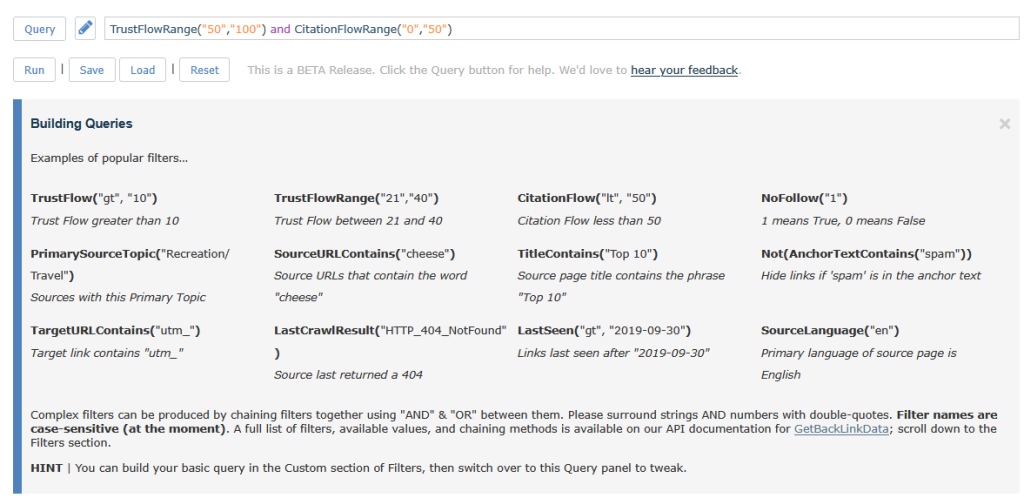 If you’d prefer a full list of filters, values, and chaining methods, it is available on our API documentation for GetBackLinkData in the section titled “Filters”.