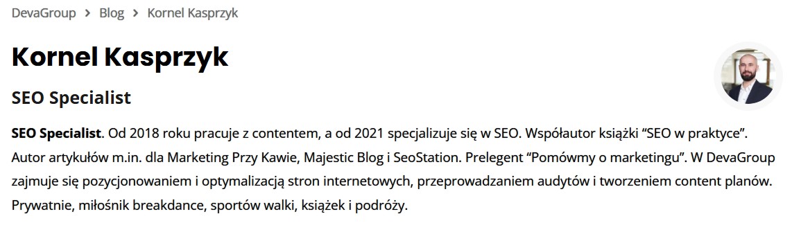 Od 2018 roku pracuje z contentem, a od 2021 specjalizuje się w SEO. Autor artykułów m.in. dla Marketing Przy Kawie i Majestic Blog. W DevaGroup zajmuje się pozycjonowaniem i optymalizacją stron internetowych, przeprowadzaniem audytów i tworzeniem content planów.