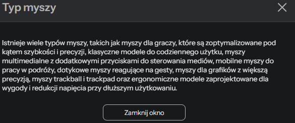 Przykład: W sklepie internetowym x-kom.pl przy opcjach filtrowania dla myszek komputerowych pojawia się mała ikona „i” w kółku. Po kliknięciu w nią wyskakuje okienko z definicją napisaną prostym językiem.
