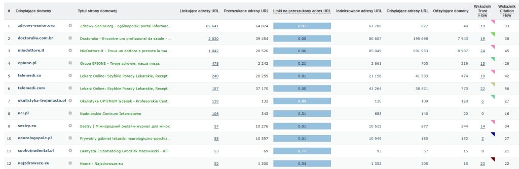 Mając listę domen, warto zweryfikować, czy strona ma pozyskać wartościowe linki zwrotne. Informacje te można uzyskać poprzez weryfikację parametrów Trust Flow, Citation Flow, weryfikację Link Graph oraz Link Profile.