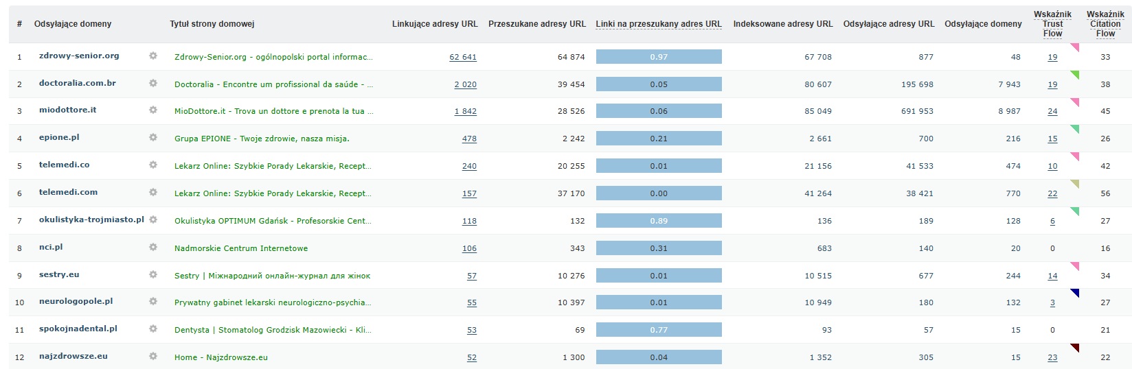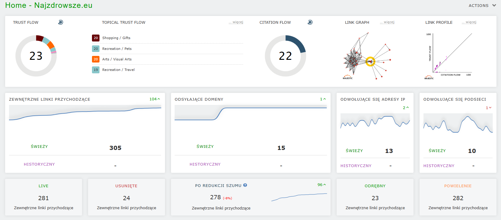 Mając listę domen, warto zweryfikować, czy strona ma pozyskać wartościowe linki zwrotne. Informacje te można uzyskać poprzez weryfikację parametrów Trust Flow, Citation Flow, weryfikację Link Graph oraz Link Profile.